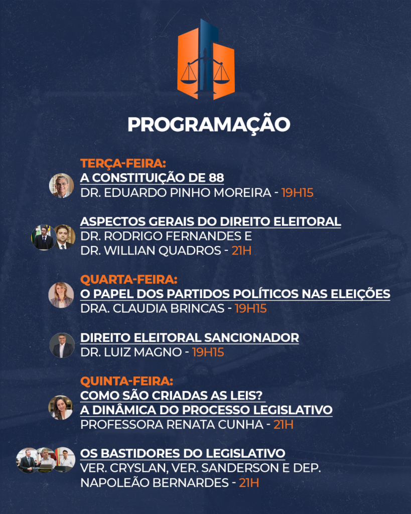 Nesta quarta-feira (03), o vereador Cryslan disponibilizou a programação da 2ª Edição do Curso de Direito Eleitoral e Processo Legislativo. Serão 5 palestras, além de um debate entre parlamentares catarinenses sobre os “Bastidores do Legislativo”.